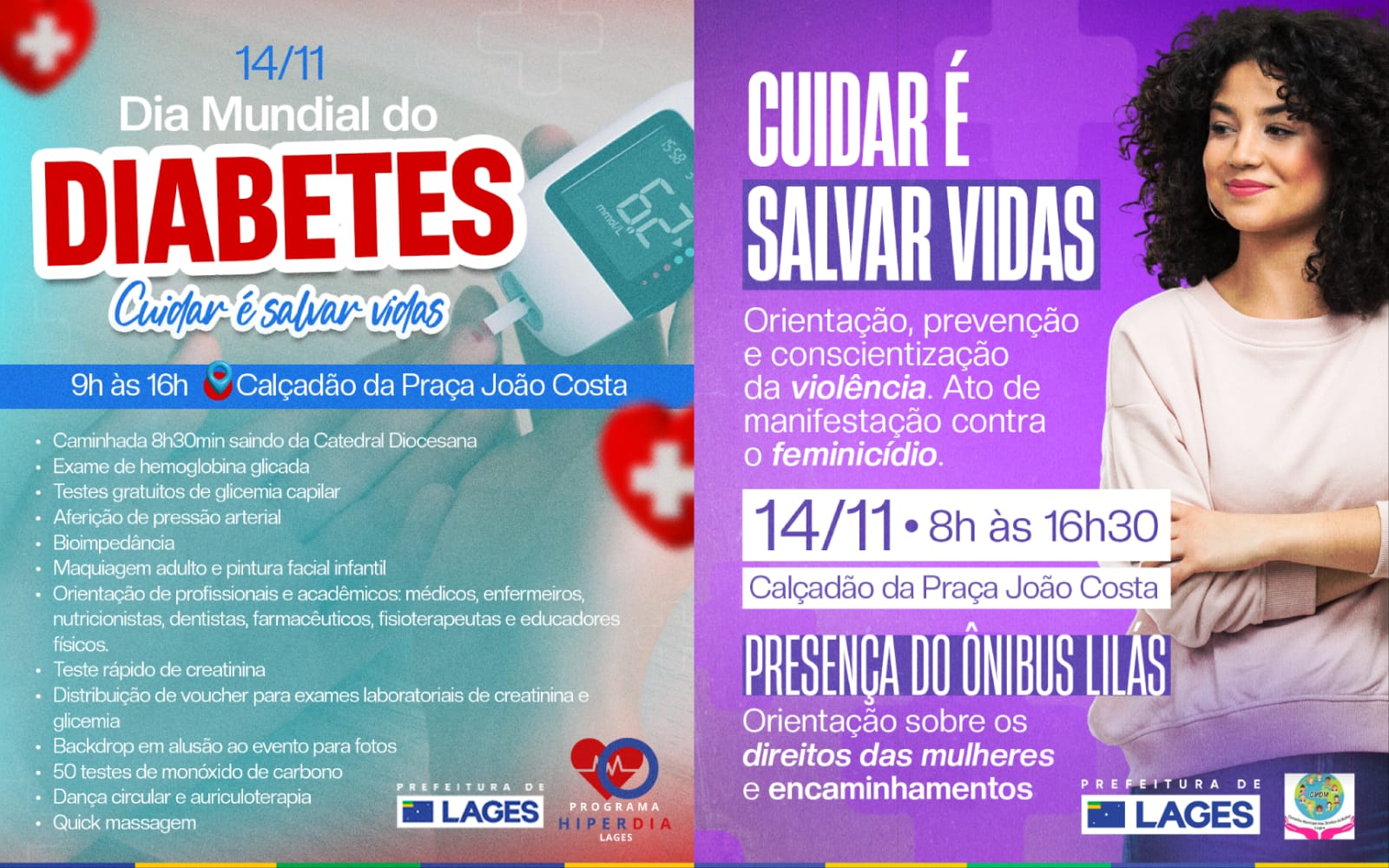 Continuar lendoA Prefeitura de Lages, por meio da Secretaria da Saúde e Secretaria Municipal de Políticas para a Mulher e para o Idoso, realiza duas ações integradas, dentro do projeto “Cuidar é salvar vidas”. As iniciativas acontecem de forma conjunta no dia 14 de novembro, no calçadão...