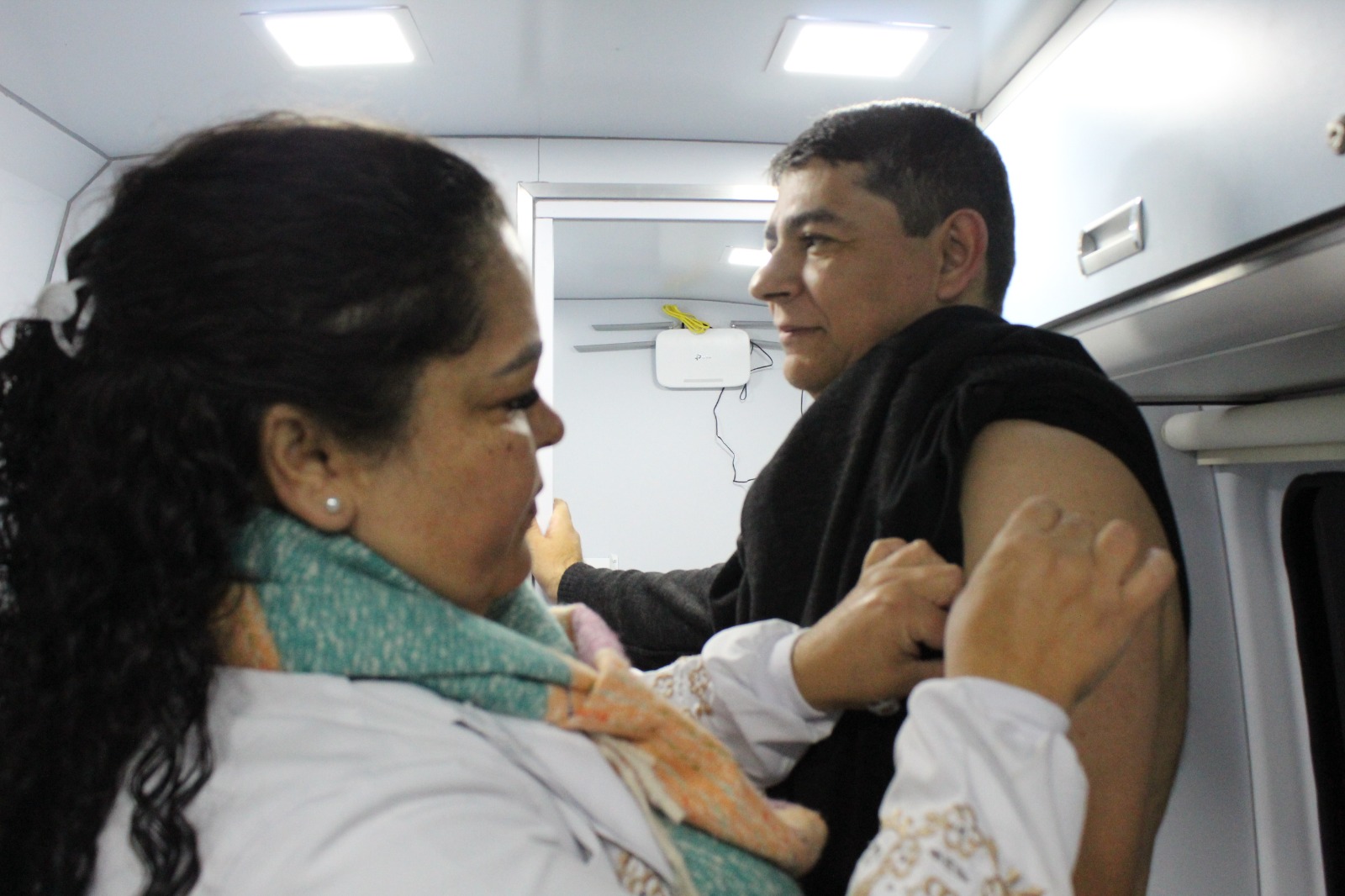 O veículo esteve estacionado durante todo o dia no calçadão da Praça João Costa, onde foram aplicadas 268 doses de vacina contra a gripe (Influenza).