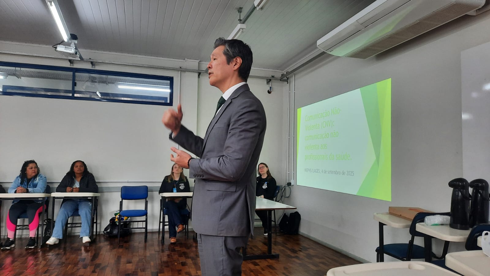 O Núcleo de Educação Permanente e Humanização em Saúde (Nephs), ligado à Secretaria da Saúde, realizou, nesta quinta-feira (4 de setembro), uma ação de vivência sobre comunicação assertiva e comunicação não violenta. A palestra foi ministrada pelo juiz da 4ª Vara Cível da Comarca de Lages, Alexandre Takaschima, no auditório da Universidade do Planalto Catarinense (Uniplac).